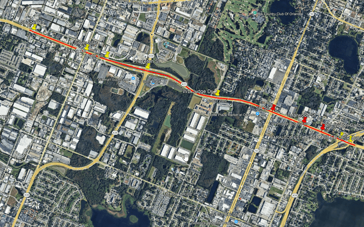 Intelligent Transportation System improvements on State Road 423 from SR 408 to Shader Road, approximately 3.031 miles in Orange County. Radar sensors are used to detect high-profile vehicles at signalized intersections.